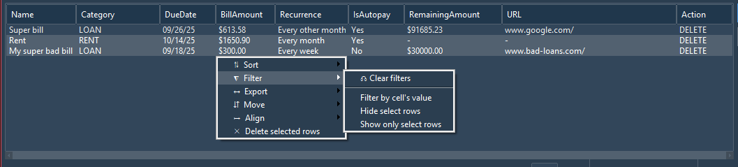 If multiple rows are selected, most options available in the right-click context menu will affect all selected rows. Quick note here: right-clicking on a bill and selecting "delete selected rows" will not delete the bill in-and-on-itself. It will still remain in the database. and be available again after refreshing the table.