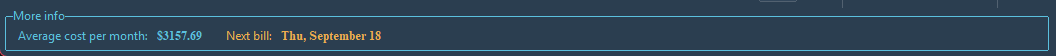 The "Next bill" provides information on the date the next bill is expected. If the date is within the next 3 days, the displayed label will change to: "Tomorrow", "In 2 days" and "In 3 days" instead of a formatted date (e.g., "Wed, October 01").