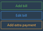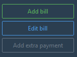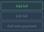 The "Add bill" button will always be enabled by default. The "Edit bill" button will be disable by default and will require a row to be selected in order to be enabled. All bills can be edited. The "Add extra payment" button will be disabled by default and will not only require a row to be selected, but the selection should also have a "remaining amount" set (see below for more information).