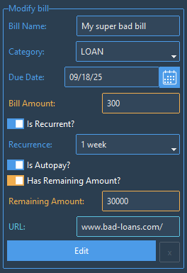 - Category [Required]: dropdown with a selection of categories for the bill (e.g., Loan, Subscription, Utility, etc...) This isn't used too much aside from sorting and/or filtering the bills in the table by their category.