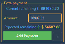 This control allows to update a bill's remaining amount with an extra payment. Here is a little disclaimer: the remaining amount isn't reflective of the actual bill. When calculating the new Expected remaining $, the calculation is simple: