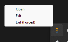 3 different options will be available by right-clicking on the icon: "Open", "Exit" and "Exit (Forced)".
